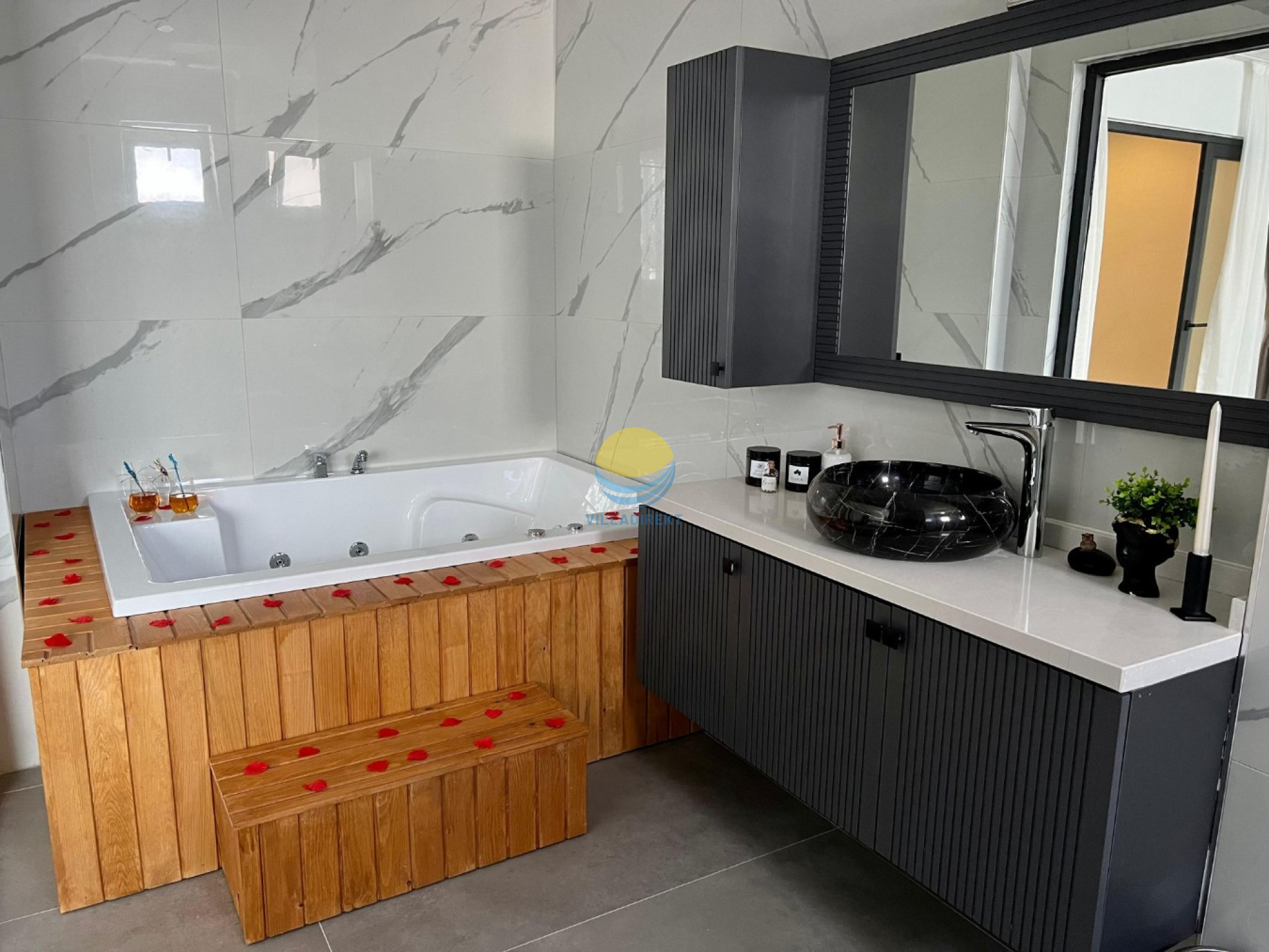 1. Schlafzimmer: 1 Doppelbett, Kleiderschrank, Klimaanlage, Nachttisch, Schminktisch, Jacuzzi, Bad und WC.