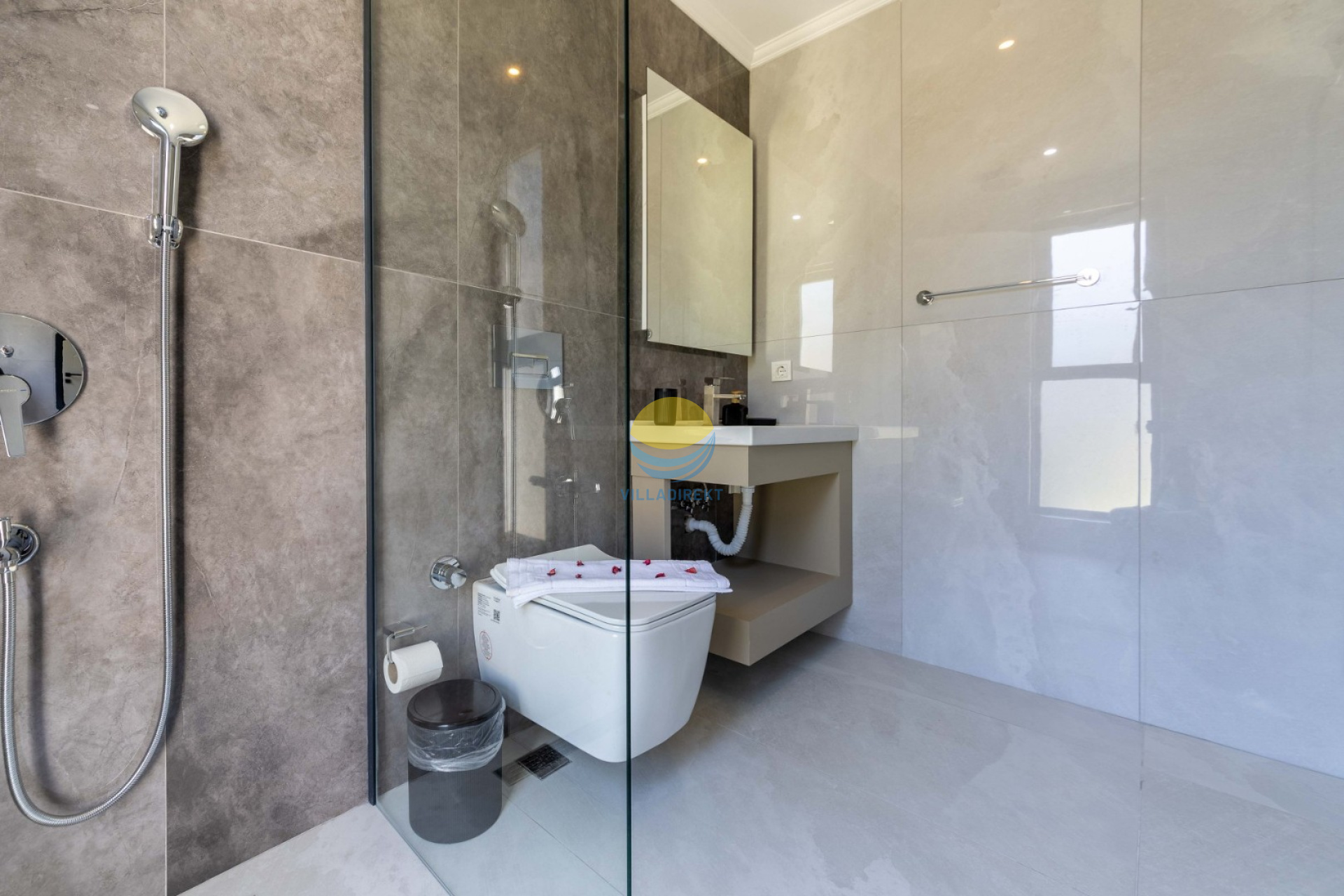 1.Schlafzimmer: 1 Doppelbett, Klimaanlage, Nachttisch, Schminktisch, Kleiderschrank, Whirlpool, Bad und WC.